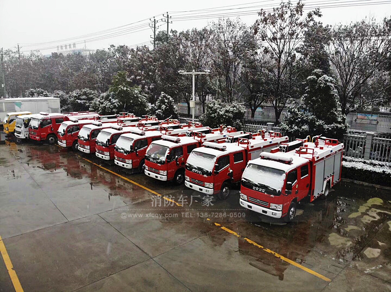 今天;我要发的是7台小型东风水罐消防车、载水量2.5吨、配20消防泵、20消防炮、射程也可达50米;虽说吨位比较小。但是全部都是国标标准的配置、所需要的随车消防器材也是一样不少、这批水罐消防车是发往甘肃张掖的、算上路上跑的时间、刚好是富余几天到交货期;客户那边也给予了充分的理解、可以等雪小了之后再出发、防止路上上冻结冰不好走。