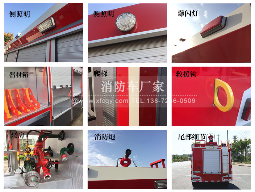 驾驶室顶部前端为长排警灯,车身后配有24V/60W火场照明灯一只,车辆两侧上方各配有红蓝相配的爆闪灯,下方安装安全标志灯,乘员室、器材箱、 泵房内均装有照明灯,加装有100W警报器,回转警灯开关、通讯设备预备接口。